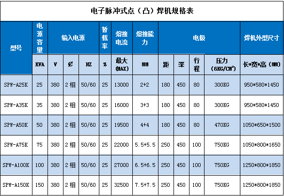 3、設置產品焊接參數。點焊機的主要焊接參數包括焊接電流、焊接時間和焊接壓力,蘇納爾提醒大家這三個焊接參數要根據焊接工件的實際情況有針對性的設置。一般情況下,壓力控制在0.2-0.4Mpa,根據需要可以上下調整,而焊接電流在調試的時候盡量從小往大來調節,以避免焊接電流太大而產生飛濺或是毀損電極。三個焊接參數調節相輔相成,互相配合,缺一不可,蘇納爾提醒大家任何一個產品焊接都應該有一個極為合適的焊接參數臨界點。